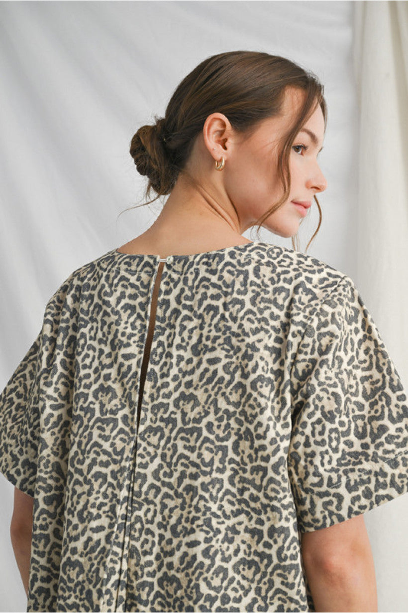 Loose fit leopard dress with pleat back accent, drop shoulder, side pocket, button closure back.- Model is 5'10'' and is wearing a Small.
