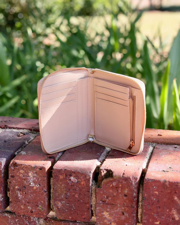 The Blakely Wallet in Champagne Pop offers a sleek, glittery gold quilt-textured design perfect for everyday elegance. Featuring a full zip closure, it securely holds your essentials inside—card slots, a bill fold, and a zippered coin pocket—all neatly organized for convenience. The classic style is enhanced by a refined gold logo and zipper, making it a stylish yet functional accessory for any occasion.