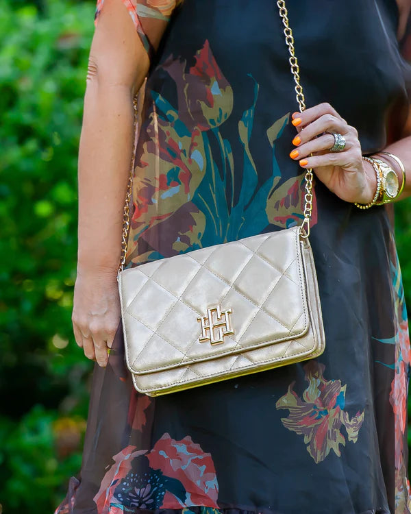 This metallic textured, vegan leather crossbody is equipped to keep you organized! There are built in credit card slots inside as well as a zippered pocket and open pocket. It features the signature, shiny gold Caroline Hill logo on the front magnetic flap. The chain crossbody strap has a strip of matching material to sit comfortably on your shoulder. It can also be removed to carry as a stylish clutch. Great for events or everyday wear!