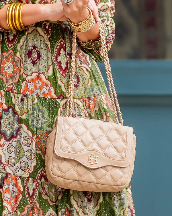 The Elle Crossbody Spotted DQ combines chic design with versatile functionality. Crafted from soft quilted faux lambskin featuring a trendy spotted diamond pattern, it offers a stylish foldover silhouette perfect for any occasion. The adjustable woven chain strap allows you to customize your look, while the classic logo adds a polished touch. Effortlessly elevate your outfit with this fashionable crossbody bag made for day-to-night wear.