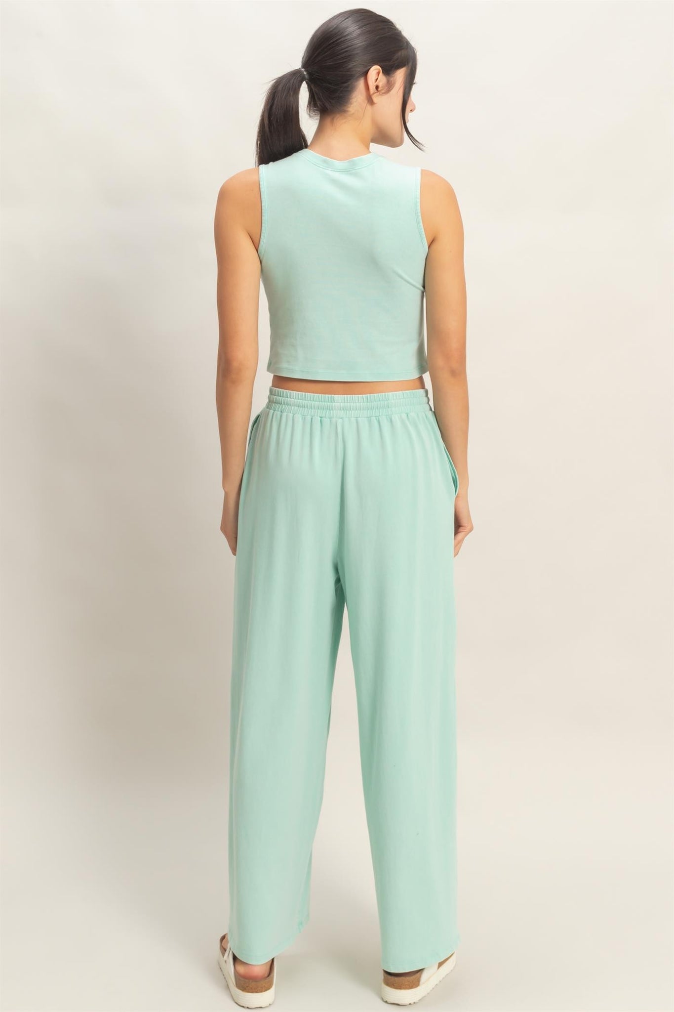 This two-piece set is enhanced with a mineral wash treatment. The sleeveless, cropped top features a classic ribbed crew neckline and princess lines for a structured silhouette. The accompanying wide-leg pants are relaxed fit and features an elastic drawstring waist with side pockets. Pair with clean trainers for a laid-back look.