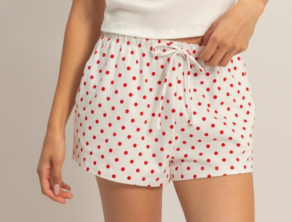 Infuse your lounge rotation with these soft cotton-spandex shorts, featuring a spirited polka dot print. The design prioritizes comfort with a flexible elastic waistband and functional drawstring tie. Cut in a relaxed silhouette, they include practical side pockets. Pair with the matching halter for a seamless, playful ensemble.