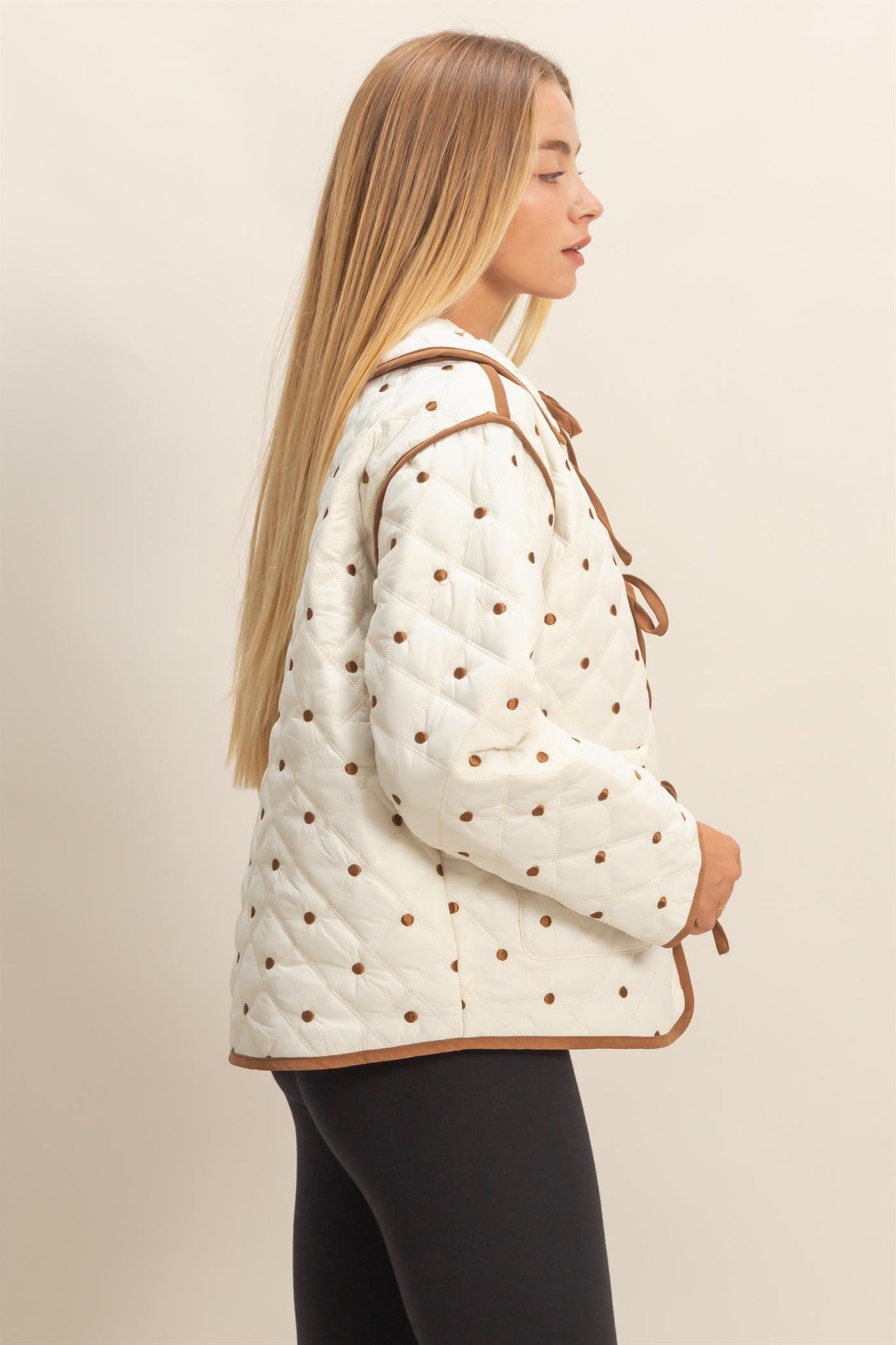 This outerwear piece redefines winter style with its distinctive quilted design and decorative tie-up closure at the front, ensuring a personalized fit. Perfect for layering over casual ensembles or adding a unique touch to a chic evening outfit. Its structured silhouette makes it ideal for crisp weather outings or stylish layering.